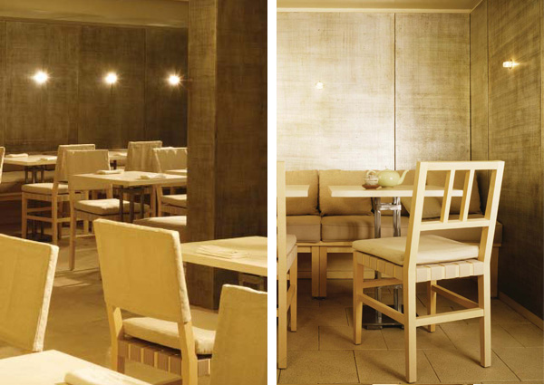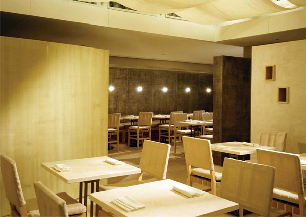 These inherent difficulties were turned into assets by using the metaphor of a walled garden; ceilings of the perimeter areas were lowered to handle the mechanical requirements, contrasting dramatically with the centrally defined restaurant and retail space. The central space was organized by a series of elegant silk ceiling panels lit from behind to give the space both height and a sense of lightness. The restaurant and retail spaces were separated by low partitions that allow the space to feel as if it continues on indefinitely. These low walls were finished in different textures and colors that were subtly manipulated to alter the space's sense of depth and richness.